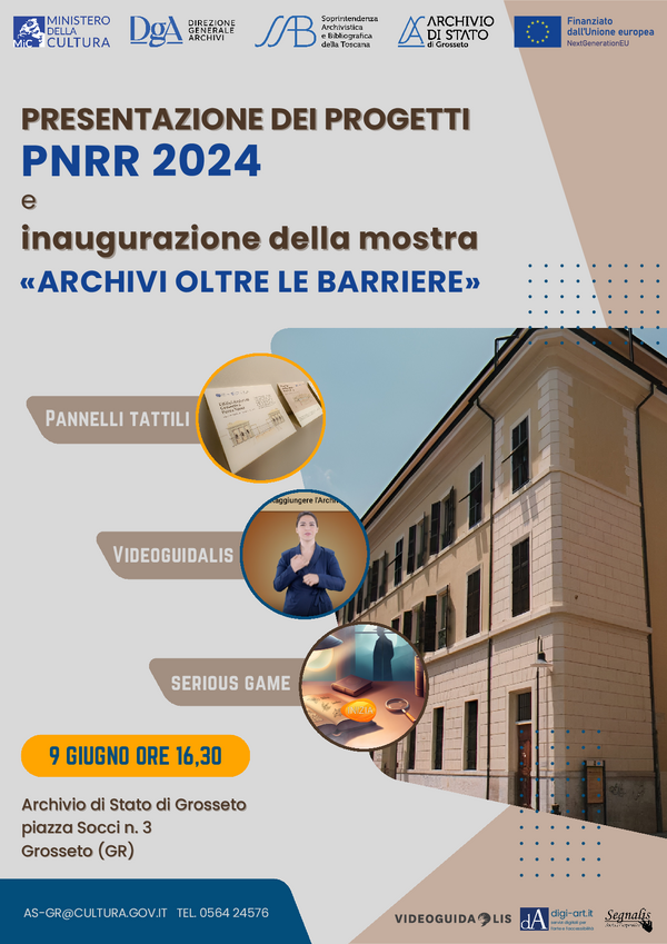Dal 2022 l’Archivio di Stato di Grosseto ha avviato l’iter per l’ottenimento di risorse economiche provenienti dal fondo PNRR per finanziare progetti finalizzati all’abbattimento delle barriere cognitive e sensoriali. Nel 2024 i progetti sono stati realizzati e oggi l’Archivio è dotato di nuovi strumenti multimediali, che consentono una partecipazione più inclusiva al nostro patrimonio. Si tratta di un Serious Game, dal titolo «Una strana nebbia a Grosseto», di una VideoguidaLIS, «Grosseto Archivio di Stato LIS», e di cinque pannelli tattili, uno che rappresenta la mappa di piano per orientare il cieco negli spazi aperti al pubblico, e gli altri quattro che restituiscono documenti conservati in Archivio di Stato di Grosseto