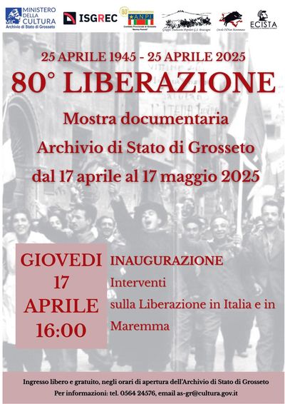 Per celebrare l'80° della Liberazione italiana l'Archivio di Stato di Grosseto con la collaborazione di ISGREC, ANPI, Gruppo Tradizioni popolari, Circolo Filatelico Numismatico maremmano ed Ecista, organizza una mostra di documenti e oggetti provenienti da collezioni private, che restano a memoria del lungo e difficile periodo della Liberazione. La mostra sarà visitabile dal 17 aprile al 17 maggio negli orari di apertura dell'Archivio di Stato.