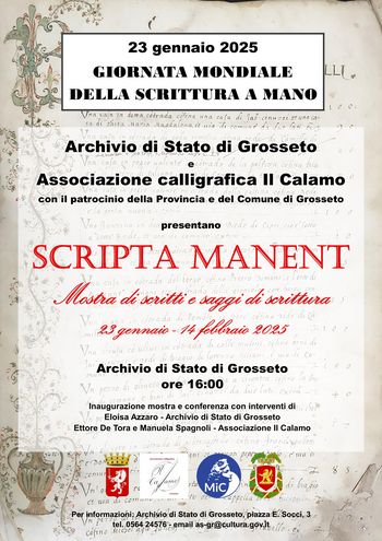 In occasione della GIORNATA MONDIALE DELLA SCRITTURA A MANO, l'Associazione calligrafica Il Calamo, in collaborazione con l'Archivio di Stato di Grosseto, e con il patrocinio della Provincia e del Comune di Grosseto, presenta: