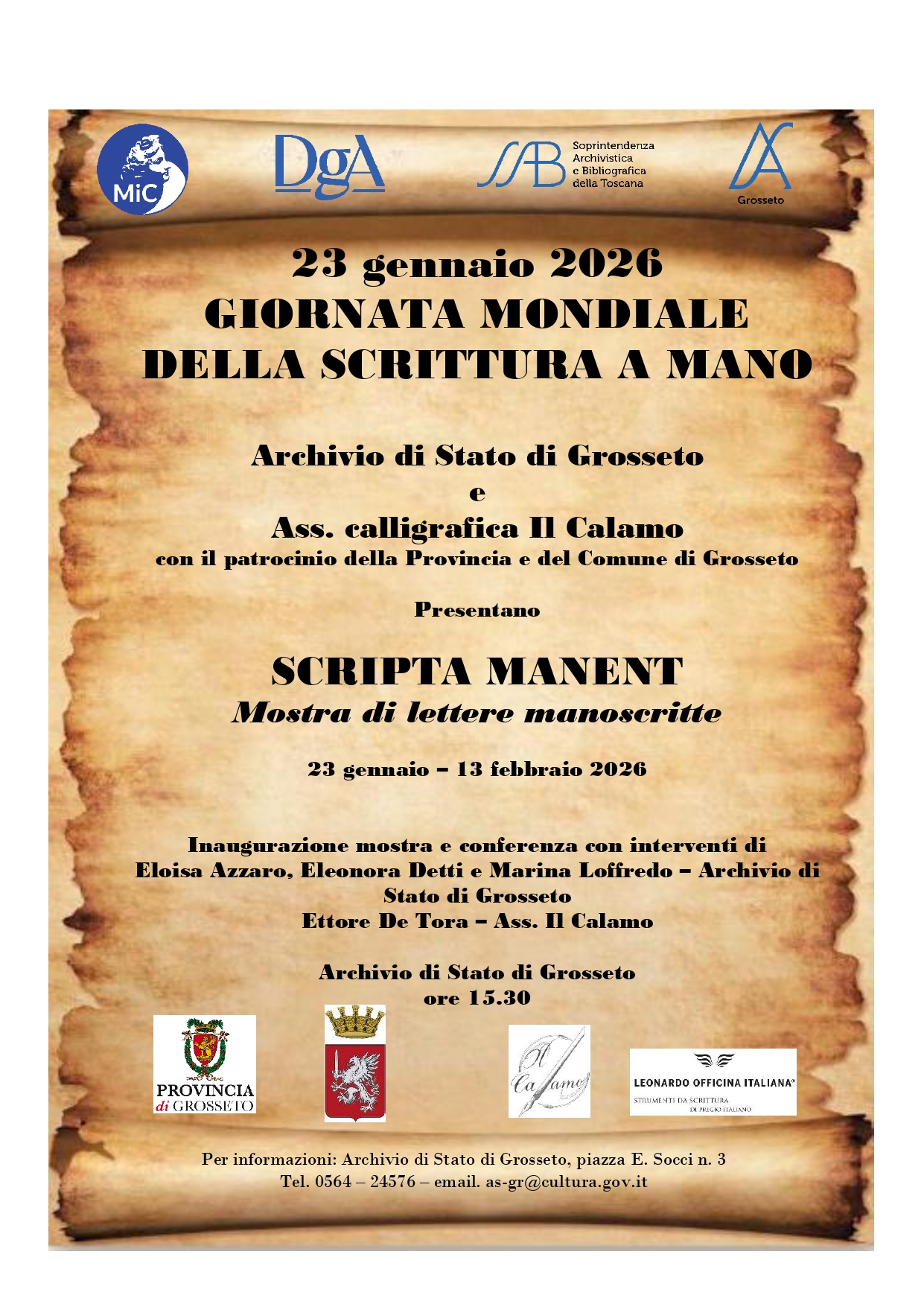 In occasione della Giornata mondiale della scrittura a mano, l'Archivio di Stato di Grosseto, in collaborazione con l'Associazione grossetana “Il Calamo” e con il patrocinio della Provincia e del Comune di Grosseto, presenta: